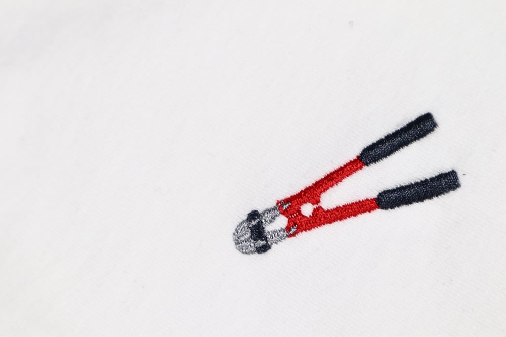 Weißes T-Shirt mit kleiner Bolzenschneider-Stickerei auf der Brust