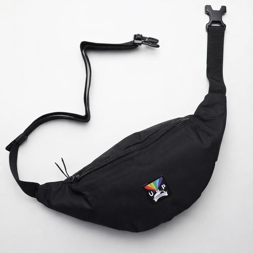 Hipbag aus recyceltem Polyester – verstellbarer Gurt, Hauptfach mit Reißverschluss, zusätzliches Innenfach. Mit farbenfrohem Regenbogen-„UP Patch“.
